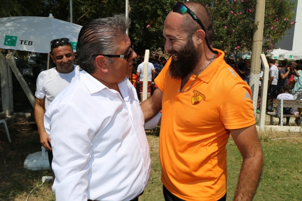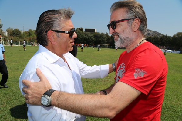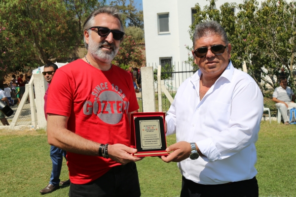 Suriyeli ve Türk çocukların yaptıkları dostluk maçının başlama vuruşunu Taner Uslu ile birlikte yapan Talat Papatya, "30 Ağustos Bodrum Çocuk Zafer Kupası"na verdiği desteklerden dolayı Başkan Mehmet Kocadon adına düzenlenen plaketi Uslu'ya takdim etti.