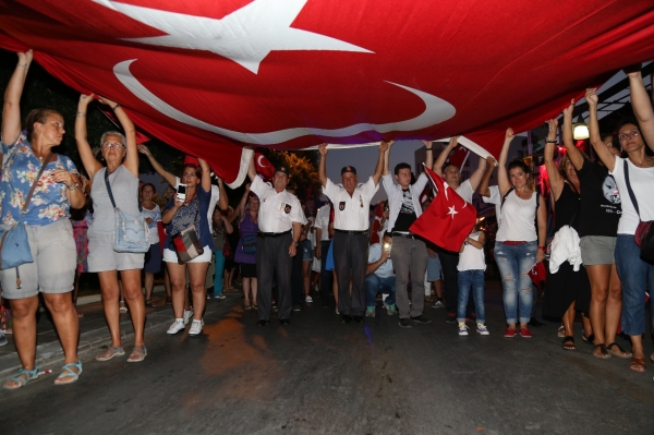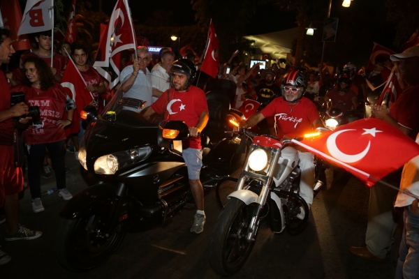 10. Yıl Marşı eşliğinde yürüyüş yapan binlerce kişiye caddede yer alan restoran ve eğlence mekanlarındaki vatandaşlar da bayrak ve meşalelerle destek verdi.