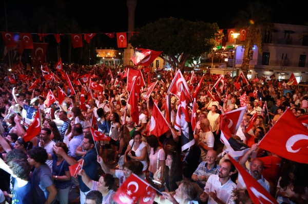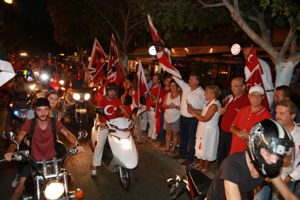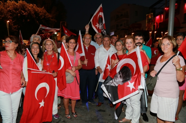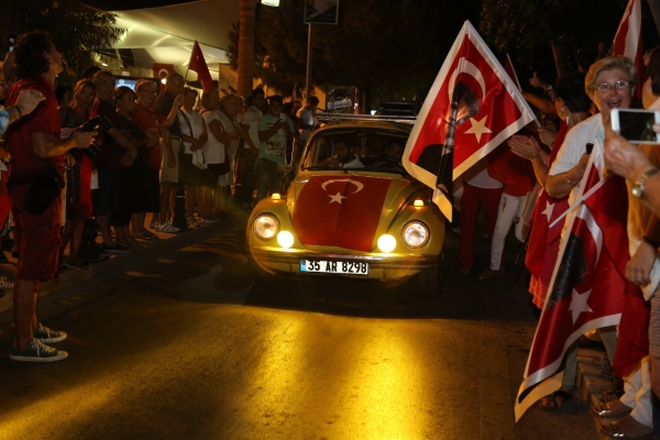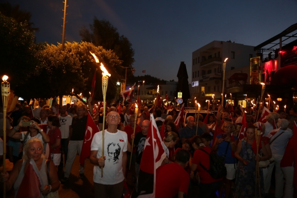 Bodrum Milta Marina’dan başlayan fener alayına, Neyzen Tevfik Caddesi boyunca ellerinde meşaleler ve Türk bayraklarıyla katılan vatandaşlar coşku dolu anlar yaşattı. Bodrum Vosvos Kulübü üyeleri de etkinliğe bayraklarla süsledikleri arabalarıyla katıldı. Araçların üzerine çıkan kulüp üyeleri, ellerinde tuttukları bayraklarla fener alayına renk kattı.