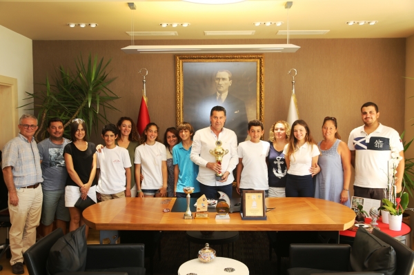 Era Bodrum Yelken Kulübü'nün başarılı yelkencileri, Bodrum Belediye Başkanı Mehmet Kocadon'u makamında ziyaret etti.