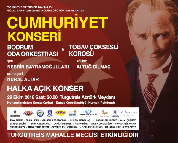 Bodrum Oda Orkestrası ve TOBAV’ın (Devlet Tiyatrosu Opera ve Çalışanları Yardımlaşma Vakfı) yer alacağı konser, 29 Ekim Cumartesi günü Turgutreis Atatürk Meydanında saat 20.00'de başlayacak.