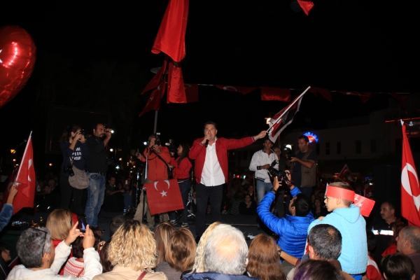 “Buradan sizleri görmek, tarif edilemez güzellikte. Gönül ister ki; Anadolu’nun her meydanında bu coşkular, bu güzellikler, bu Cumhuriyet Bayramı böyle kutlansın. Bu bayram; ümmetçilikten kurtuluşun ve birey olmanın bayramıdır, hak ve özgürlüklerin bayramıdır, laik olma bayramıdır, seçme ve seçilme hakkını kazanmanın bayramıdır. Bugün bu meydanlarda, bu günü coşkuyla kutlayabiliyorsak, coşkuyla sizlere seslenebiliyorsam ve sizin belediye başkanınızsam, işte bunun altındaki tek eser, laik Cumhuriyet’tir. Bu güzel topluluğu, dünya barış topluluğu gibi yaşayan Bodrum Yarımadası’nın güzel insanları, bu bayrağı taşımaktan ve sizin gibi aydınlık, medeni insanların belediye başkanı olmaktan, son derece gururlu ve mutluyum. Hadi gelin hep beraber, bu güzel mutluluğu ve beraberliği, Anadolu’nun, güzel ülkemizin her bir yanına taşıyalım. Bu güzellikleri hep birlikte yaşayalım. Hepinize teşekkür ediyorum, sevgi ve saygılarımı sunuyorum.”