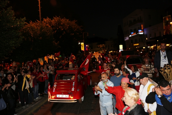 Akşam saat 19.00’da başlayan fener alayı ve kortej yürüyüşünde etkinliğe renk katan motosikletliler, Bodrum Bisiklet Kulübü’ne üye bisikletliler ve Bodrum Vosvos Derneği üyeleri, Türk bayraklarıyla sarıp süsledikleri araçlarıyla hareket etti. Ardından binlerce vatandaş, bando eşliğinde çalınan marşlara eşlik ederek yürüyüşe geçti. Neyzen Tevfik Caddesi boyunca coşku içinde yürüyen kalabalığı alkışlayan çevredeki iş yerleri de astıkları bayraklar ve çaldıkları 10. Yıl Marşıyla Cumhuriyet coşkusunu paylaştı.