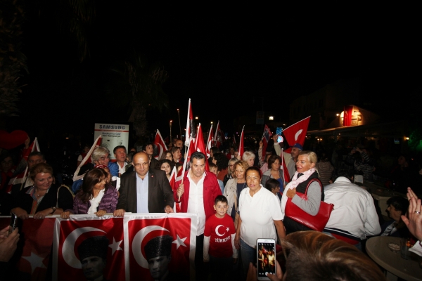 Bodrum Milta Marina önünde toplanan vatandaşlar, Neyzen Tevfik Caddesi boyunca ellerine aldıkları meşaleleri, Mustafa Kemal Atatürk’ün fotoğrafının ve siluetinin bulunduğu ay yıldızlı bayrakları ve Türk bayraklarını sallayarak coşku içinde Bodrum Belediye Meydanı’na yürüdü. Kutlamalara Bodrum Belediye Başkanı Mehmet Kocadon, annesi Fatma Kocadon, eşi Hülya Kocadon, kızları Zeynep Kocadon ve İpek Kocadon ile birlikte katıldı. Siyasi parti ilçe temsilcileri, sivil toplum kuruluşu üyeleri, Bodrum Belediye Başkan Yardımcıları İsmail Altındağ ve Taner Uslu, Bodrum Belediyesi Meclis Üyeleri, Muharip Gaziler Derneği Bodrum Şubesi üyeleri, öğrenciler, öğretmenler ve vatandaşlardan oluşan binlerce kişi, Türkiye Cumhuriyeti’nin 93’üncü yıl dönümü coşkusuna ortak oldu.