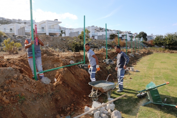 Bodrum Belediyesi tarafından çocukların ve gençlerin daha fazla spor yapabilmesine olanak sunmak amacıyla Gümüşlük Mahallesi’nde bulunan futbol sahasının arkasında konuşlandırılan küçük minyatür saha da düzenleniyor. 160 metrelik alanı kapsayan çalışmada toplam 60 adet direğin dikildiği saha, eksiklerinin hızla giderilmesinin ardından kullanıma sunulacak.