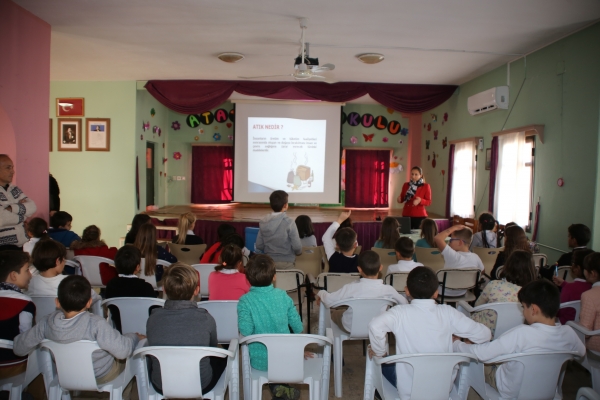 Belediyesi Temizlik İşleri Müdürlüğü’nün organizasyonuyla Atatürk İlkokulu Toplantı Salonu’nda gerçekleştirilen seminerde Temizlik İşleri personeli İpek Civelek, öğrencilere geri dönüşümün önemiyle ilgili bilgiler verdi. Ambalaj atıklarının kaynağında ayrıştırılmasının gerekliliği ve atıkların geri dönüşüm süreçlerinin anlatıldığı eğitim seminerinde Civelek, “Özellikle geri dönüşüm kutusu, çevrenin korunmasına ve doğaya büyük katkı sağlar ve doğal kaynakların korunmasına etki ederek enerji tasarrufuna da yardımcı olur. Bununla birlikte ekonomiye de katkısı olur çünkü atılan bu maddeler geri dönüştürülebilir durumdadır. Örneğin; bir ton atık kagıdın üretime katkı sağlaması, 4 ton odunun yani en az 10 yılda yetişebilecek 20 ağacın kesilmesini önler.” dedi.