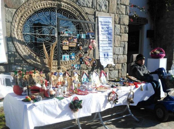 Bodrum’un Yakaköy Mahallesi’nde bulunan, etkinliğe yer desteği sağlayan Dibeklihan Kültür ve Sanat Köyü'nde gerçekleşen yılbaşı kermesinde, Bodrum Belediyesi Yakaköy Engelli Sevgi Sanat Atölyesi öğrencileri, yılbaşı için özel olarak tasarladıkları ürünlerini sergilendi. Atölyede eğitimlerini sürdüren 9 engelli vatandaşın el emeği göz nuru ahşap ve taş boyama gibi çeşitli teknikler kullanarak hazırladıkları hediyelik ve ev dekorasyonu eşyalardan oluşan yaklaşık 150 parça ürün, açılan stant üzerinde şık süslemelerle vatandaşların ilgisine sunuldu. Satın alınan ürünlerden el edilen gelirlerin de atölyenin ve engelli bireylerin ihtiyaçları için kullanılacağı belirtildi.