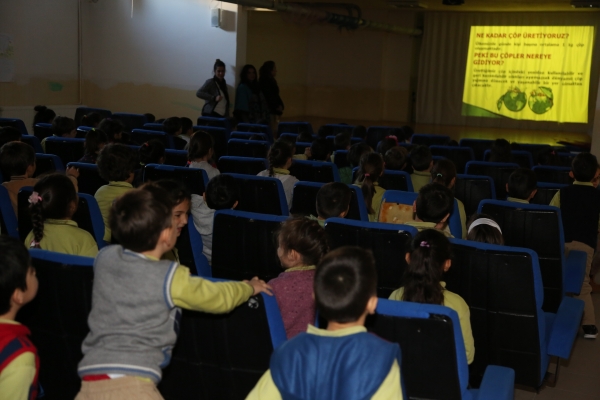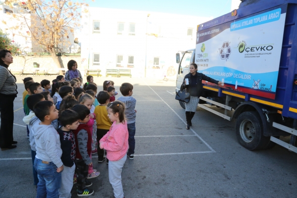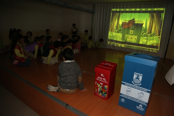 Küçük yaştaki öğrencilere çevreyi koruma bilincini aşılamak amacıyla Bodrum Belediyesi tarafından düzenlenen “Geri Dönüşüm” konulu eğitim seminerlerine devam ediliyor. Program kapsamında atık pil kutuları ile geri dönüşüm kutuları da okul içinde belirlenen alanlara konuluyor.