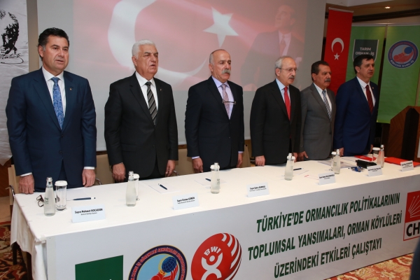 Cumhuriyet Halk Partisi Genel Başkanı Kemal Kılıçdaroğlu ise çalıştaya destek veren tüm kurum ve kuruluşlara teşekkür ederek, “Sayın genel merkezimiz, değerli milletvekili arkadaşlarımız, belediye başkanlarımız, sevgili vatandaşlarım. Aslında Türkiye'nin çok temel bir sorununa nasıl çözüm üretebiliriz, onun için toplandık buraya. Genelde olaya şöyle bakılır; bir olay olur, bir yerde birisi çıkar, kendisine göre bir çözüm bulur. Çözümü siyasi otoriteye aktarır ve siyasi otorite de o çözümü doğru kabul eder. Olayın ayrıntılarına, derinliklerine inmez. Gerçekten sorun böyle çözülür mü? Yoksa bu çözüm yolu, başka sorunlar yaratır mı ya da yaratmaz mı, bunları pek düşünmez. Siyasetimiz ne yazık ki, Türk siyaseti, sorunlara derinlikli bakan bir gelenekten gelmiyor. Özellikle sağ siyasetin temel özelliği bu. Var olan bir sorun var, birisi sorunu şöyle çözelim der, öyle çözmeye kalkarlar ve arkasından zincirleme başka sorunlar ortaya çıkar. Uygar dünyanın sorunlara bakışıyla uygar olmayan dünyanın sorunlara bakışı arasında temel farklılık budur. Uygar dünyada bir sorun varsa, otururlar sorunun bütün ayrıntılarını tartışırlar ve görüşürler. Sorunun taraflarını çağırırlar. Sorundan etkilenenleri ve bilim insanlarını çağırırlar, uzun bir hazırlık dönemi yaparlar. Uzun bir hazırlık dönemi! Sonra uygulama dönemleri çok kısadır, uzun hazırlık döneminin gerekliliklerini yaparlar ve sorun çözülür. Uygarlığı henüz yaşamamış veya tam sindirememiş toplumlarda ise bir gelenek vardır: hele bir yola çıkalım, kervan yolda düzülür. Kaş yarılır, göz yarılır, adam ölür, insanlar hayatını kaybeder ama derler ki; ilerde doğru yolu bulacağız. Ve bunun topluma maliyeti çok ağır olur. Ormanda yaşadığımız da buna benzer bir olay. Şimdi hocalarımı dinleyince olayın ne kadar derinlikli olduğunu görüyorsunuz. Ve siyaset kurumunun bu kadar derinlikli bir soruna nasıl yüzeysel baktığını da görüyorsunuz. Veriler doğru değil, aldatma üzerine inşa edilmiş veriler. Sorunlar tam teşhis edilmemiş. Bir doktor düşünün hasta önüne geliyor, hastalığı teşhis edemezseniz zaten onu tedavi edemezsiniz ki. Önce teşhisi doğru koymanız lazım ki, tedavi edebilelim. Biz sorunlara sağlıklı teşhis koyamayan bir siyaset geleneği iktidarda tutuyoruz ve Türkiye'nin temel sorunlarından birisi bu. Sanmayın bu sadece ormancılık alanında böyle, her alanda böyle. Dış politikaya bakın, Türkiye tarihinin en derin yenilgilerinden birini yaşıyoruz. Asgari ücret az önce arkadaşlar söyledi, belirlenmiş. 1404 lira. 4 lirayı niye ilave ettiler, anlamıyorum. Ben merak ediyorum; mesela Sayın Cumhurbaşkanı, Sayın Başbakan, Sayın Milletvekilleri bir ay 1404 lirayla geçinsinler bakalım evlerini nasıl geçindiriyorlar. 1404 lirayla eğer bir aile hayatını sürdürebiliyorsa, yol parası verebiliyorsa, kira parası ödüyorlarsa, çocuklarının okul masrafını karşılıyorlarsa onlar da bir denesinler. Onun hayatını bir görsünler. Asgari ücretli nasıl geçiniyor bir görsünler. Bizim anayasamızda değiştirilmesi dahi teklif edilemeyen bir madde var: ‘Türkiye Cumhuriyeti, demokratik, laik, sosyal hukuk devletidir’ der. Sosyal devlet dediğimiz kavram, acaba siyasetçiler tarafından yeteri kadar içselleştirildi mi? Sosyal devletin gereklerini yeteri kadar yerine getiriyor muyuz? Aslında unuttuğumuz noktalardan birisi bu ve asıl tartışmamız gereken noktalardan birisi bu. Sosyal devlet, güçlüler karşısında güçsüzleri korumaktır aslında. Düşük gelirlileri korumaktır. Onlara ek gelir kaynakları yaratmaktır. Onları toplumun onurlu birer bireyi haline getirmektir. Onları yoksulluğa mahkum etmemektir sosyal devlet. Ama bütün bunları yaparken, sosyal yardımları yaparken, sosyal politikaları oluştururken, insan onurunu dikkate alan devlettir sosyal devlet. Onun yoksulluğunu teşhir etmeyendir sosyal devlet. Orman köylüsü, siyasetçilerin unuttuğu bir gruptur. Bir kitledir orman köylüleri. Cumhuriyet Halk Partisi bunu rahatlıkla söyleyebilir. Orman köylüsü, Cumhuriyet Halk Partisine yeteri kadar oy vermez. Kendisini açlığa mahkum eden partilere oy verirler. Ama onların da artık uyanmaları gerekiyor. Ağacı keserken, ağacı taşırken az önce fotoğraflarını gördük, yaşanan dramları da gördük. Bu yaşamı onlara kim biçti? Kim onların önüne böyle bir yaşam koydu? Onlar da bu ülkenin onurlu birer bireyleri değil mi? Bir zenginliğin içinde bir ormanın içinde yaşıyorlar. Doğasıyla ağaçlarıyla her şeyiyle güzel olan bir alandır, orman bir coğrafyadır. Orman köylüsünü orman işçisini açlığa mahkum etmek neden? Çalışıyoruz çaba harcıyoruz. Bizim bilgi dünyamızı hocalarımız zenginleştirdi. Pek çok şeyi kendilerinden öğrendik. Öğrenmeye de devam edeceğiz. Onlar kendi alanlarının uzmanları. Eğer siyaset kurumu bilgiye dayalı çözüm üretmezse, onun adı çözüm değildir; yapay çözümlerdir. Biz bilgiye dayalı, kültüre dayalı çözüm üretmek istiyoruz. Sorunu yaşayandan da sorunu araştırandan da bilgi edinmek istiyoruz. Sorunu yaşayan anlatacak, hangi sorunlarla karşılaştığını. Sorunu araştıran, bu sorun nasıl çözülür diye önümüze seçenekler koyacak. Ve bizler de oturacağız o seçeneklerden yararlanarak kendi seçim bildirgemizi hazırlayacağız. Diyeceksiniz ki ortada seçim yok bir şey yok neden CHP bu işlerle ilgileniyor. Cumhuriyet Halk Partisi, Türkiye’nin bütün sorunlarıyla ilgilenen ve çözüm üreten ki bakın, bütün sorunlarına çözüm üreten tek partidir. Üstelik ürettiği çözümler, diğer siyasal partiler tarafından da örnek alınan çözümlerdir. Bizim emeklerimizi, alın terlerimizi, kendi seçim bildirgelerine aktaran partilerd