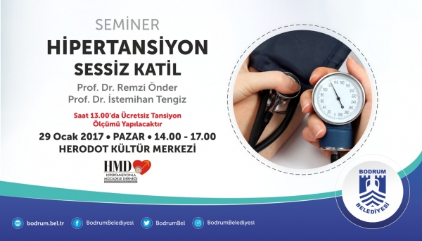 Bodrum'un Konacık Mahallesi'nde yer alan Bodrum Belediyesi Herodot Kültür Merkezi’nde, 29 Ocak 2017 Pazar günü saat 14.00’te başlayacak olan “Hipertansiyon Sessiz Katil” seminerine Bodrum’da bulunan tüm vatandaşlar davet ediliyor. Hipertansiyonla Mücadele Derneği'nden Prof. Dr. Remzi Önder ile Prof. Dr. İstemihan Tengiz tarafından verilecek olan seminerde; sağlık açısından tehlike olarak görülen, dolayısıyla da “sessiz katil” diye anılan “hipertansiyon” hastalığı hakkında vatandaşlara üç saat boyunca bilgilendirme yapılacak.