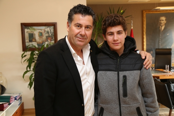 Bodrum Belediye Başkanı Mehmet Kocadon'u makamında ziyaret eden lise öğrencisi Salih Yükselen, Başkan Kocadon ile sohbet ederek yapmış olduğu bir puzzle tabloyu da kendisine hediye etti.