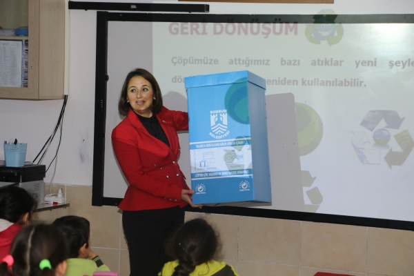 Bodrum Belediyesi Temizlik İşleri Müdürlüğü personeli İpek Civelek tarafından verilen eğitim seminerinde öğrencilere, çevrenin korunmasının önemi, atıkların geri dönüşümü ve geri kazanımı vb. konular hakkında bilinçlendirici bilgiler verildi. Öğrencilerin konuyu iyice anlayabilmeleri için ise geri dönüşümün önemini anlatan bir çizgi film gösterimi sunuldu. Okul bahçesine getirilen Bodrum Belediyesi’ne ait geri dönüşüm aracı da öğrencilere gösterildi.