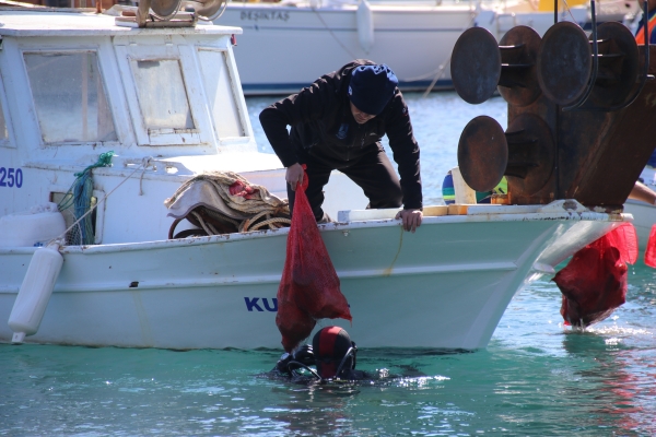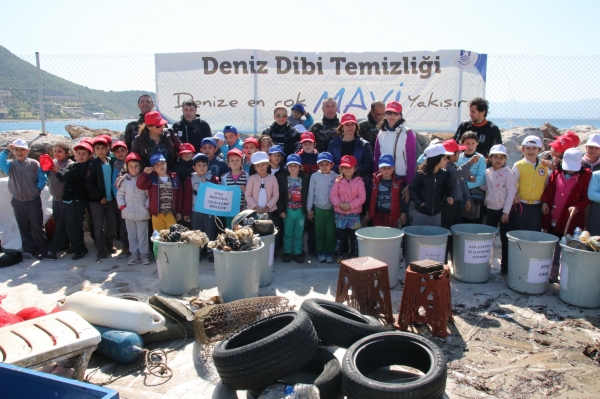 Deniz dibi temizlik kampanyası etkinliğine Akyarlar Hacı Mahmut Tınaztepe İlkokulu 3. ve 4. sınıf öğrencileri katıldı. Dalgıçların çalışmalarını takip eden öğrenciler, denizden çıkarılan atıkları da dikkatle izledi.