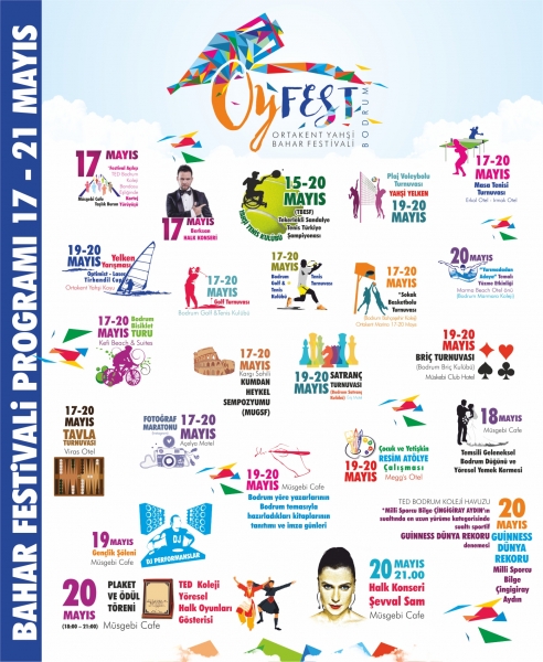 Festival, Ortakent Yahşi sahilinde 17 Mayıs Çarşamba günü düzenlenecek açılış töreni ve TED Bodrum Koleji Bandosu eşliğinde Taşlıkburun Mevkiinden Bodrum Belediyesi Müsgebi Cafe Festival alanına doğru yapılacak kortej yürüyüşüyle başlayacak. Açılış konserinde sevilen sanatçı Berksan, madalya, plaket ve ödül töreni ile yapılacak kapanışta da 'Bodrum Masalı'nın Yıldızı ünlü sanatçı Şevval Sam sahne alacak. Halka açık olarak gerçekleşecek olan konserler Bodrum Belediyesi Müsgebi Cafe önünde yapılacak.