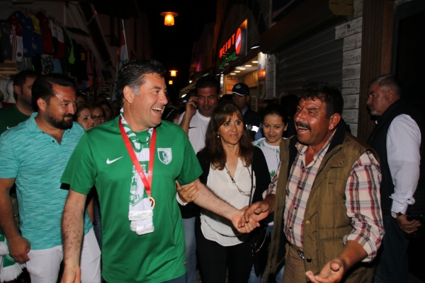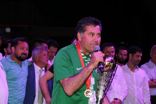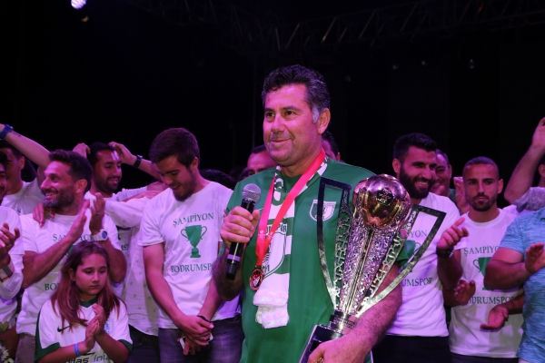 "Herkese iyi akşamlar, gerçekten güzel bir akşam. Hepimiz mutluyuz ama ben perdenin önündeki kahramanım, benim sizden bir ricam var; perdenin arkasındaki gerçek kahramanlar için, şu gördüğünüz değerli kulüp başkanım, yöneticilerim, futbolcularım ve teknik heyetim ile 12 numara olan Asi Tayfa ve Bodrum seyircisi için büyük bir alkış istiyorum. 'İnananlar asla kaybetmez" dedik, "Bir gün değil her gün Bodrumspor" dedik, "Gözlerindeki ışık medeniyet yoludur" dedik Ulu Önder Atamıza ithafen ve bu günlere geldik. Tabii ki konuşmak, eleştirmek çok kolay. Haydi ucundan tut dediğin zaman hiç kimseyi bulamazsınız. Ama bize inananlar, 4 dönemdir bana inanan Bodrum halkım ve sizler; değerli yöneticilerim, değerli sporcularım işte bize bu mutluluğu yaşatıyor. Ne güzel bu gün hep beraber inananlarla şampiyonluğu kutluyoruz. Bu güzel nur yüzlü insanların başkanı olmaktan bana bu güzel mutluluğu yaşatan değerli yönetimimle, teknik heyetimle ve güzel futbolcularımla olmaktan son derece onurluyum gururluyum. Bu huzur ve gururu güzel ülkeme armağan ediyorum. Bodrum bu güzel ülkemin dünyaya açılan en büyük medeni kapısıdır. Bu kapı ülkemin 7 bölgesinden gelen insanlarla Avrupa'dan ve dünyadan gelen insanlarla birlik beraberlik içerisinde renk, ırk, din, mezhep ayrımı yapmadan herkesi kucaklayan bir bölgedir. Bu bölgenin takımı, ülkemin gittiği her yerine birlik, beraberlik, kardeşlik ve hoşgörü götürecektir. Birlik beraberlik ve kaynaştırma özelliğini bütün güzel ülkeme Bodrumspor’la göstereceğiz ve bizi destekleyen bize inanan siz Bodrum Yarımadasının ve dışarıdan gelmiş Bodrum sevdalılarının bu şampiyonluğunu kutluyorum. Hepinize iyi akşamlar diliyorum, iyi eğlenceler diliyorum iyi ki varsınız. I love you Bodrum, I love you Bodrumspor”