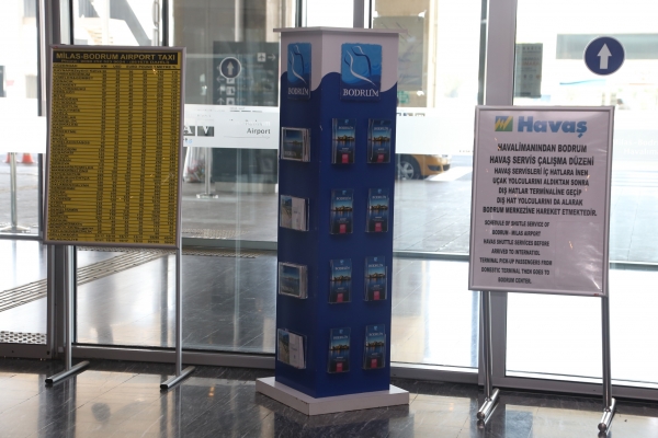 Milas-Bodrum Havalimanı’ndan giriş yapan ziyaretçilere Bodrum’u daha iyi tanıtmak için hazırlanan broşürlerin bulunduğu deskler yoğun ilgi görüyor.