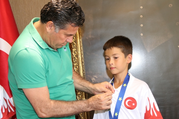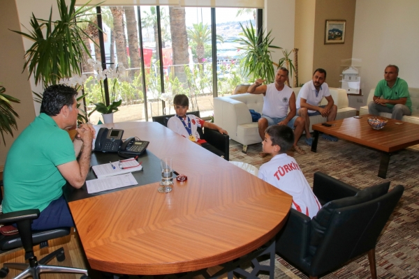 Geçtiğimiz günlerde 29 ülke ve 1.000 sporcunun katılımı ile Gürcistan’ın başkenti Tiflis’te düzenlenen “4. Geleneksel Avrupa Wushu Kung Fu Şampiyonası”nda, kendi kategorilerinde şampiyon olan Hüseyin Turgut Karabağlı Orta Okulu öğrencisi Baybars Altuntabak (11) ve Bitez Gülümser Mehmet Danacı İlkokulu öğrencisi Eren Ateş (10), Bodrum Belediye Başkanı Mehmet Kocadon’u makamında ziyaret etti.