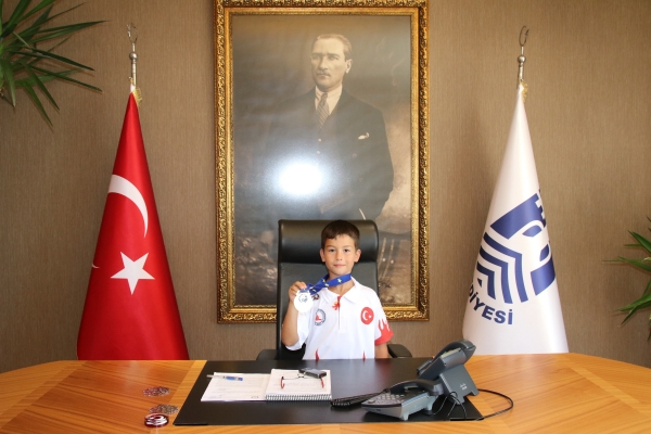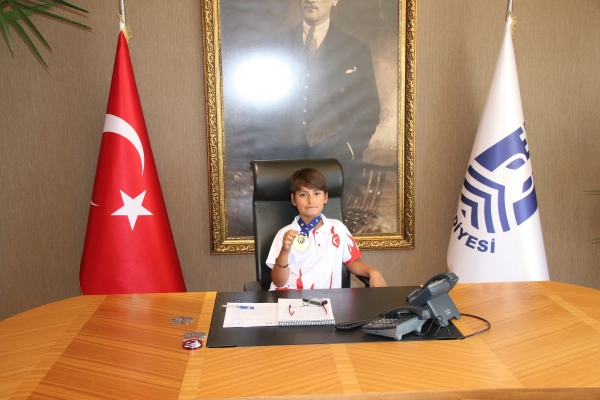 Ziyarette şampiyonların antrenörü Ali Top, öğretmeni Hüseyin Turgut Karabağlı Orta Okulu Müdürü Erkan Güngör ve Baybars Altuntabak’ın babası Ümit Altuntabak da hazır bulunurken, Başkan Kocadon şampiyonlarla yakından ilgilendi.