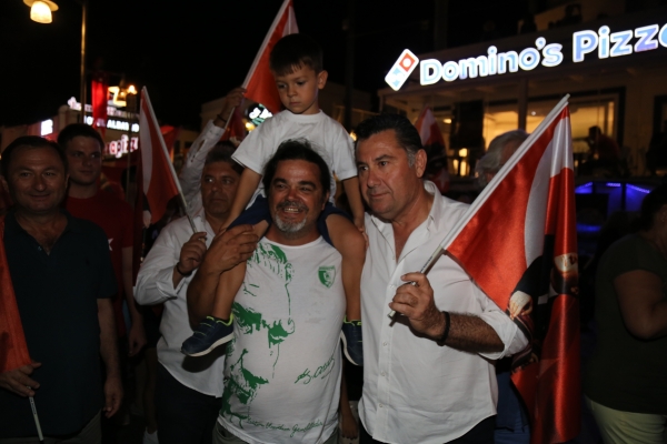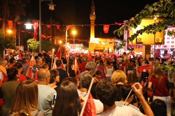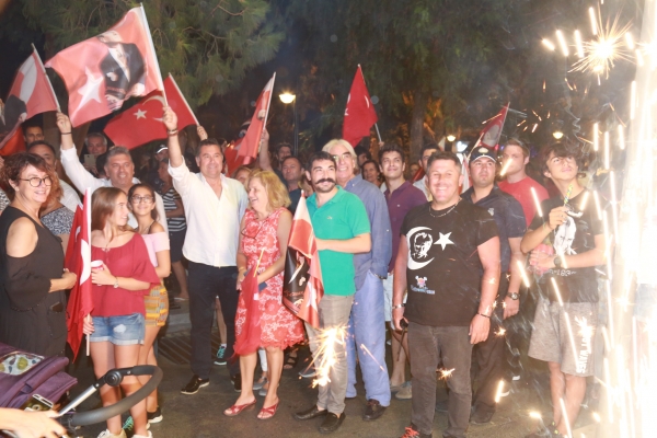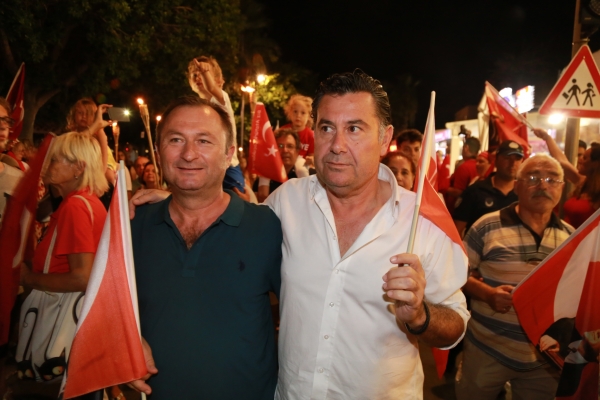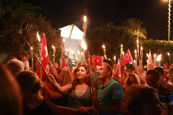 Neyzen Tevfik Caddesi boyunca ellerinde meşaleler, Türk Bayrakları ile marşlar eşliğinde yürüyen vatandaşlara mekânlarda bulunanlar da alkışlarla destek verdi.