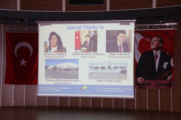 6-10 Eylül 2017 tarihleri arasında Herodot Kültür Merkezi'nde düzenlenecek olan Türk Fizik Derneği 33. Uluslararası Fizik Kongresi açılış töreni, Bodrum Kaymakamı Bekir Yılmaz ile Bodrum Belediye Başkan Yardımcısı Taner Uslu'nun da katılımıyla gerçekleştirildi.