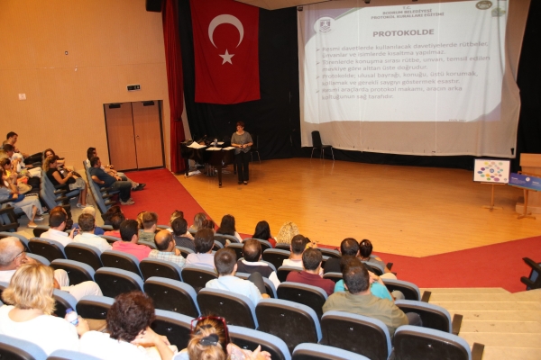 Bodrum Belediyesi İnsan Kaynakları ve Eğitim Müdürlüğünde görevli Eğitim Uzmanı Zeynep Tuncel tarafından verilen eğitim seminerinde; etik ve kamu etiği, etik davranış ilkeleri, kamu görevlilerinden beklenen etik davranışlar konuları ve resmi protokol kuralları ele alındı.