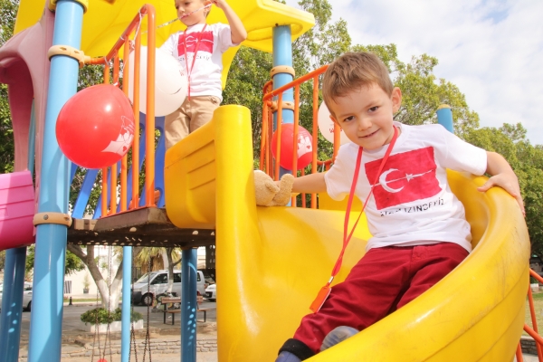 Bodrum’daki anaokulu öğrencileri, bu yıl 94. yılı kutlanacak olan 29 Ekim Cumhuriyet Bayramı öncesi belediyeye ait çocuk parklarını, kırmızı beyaz balonlarla süsledi.