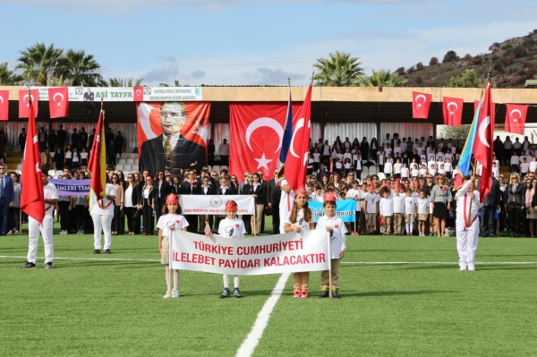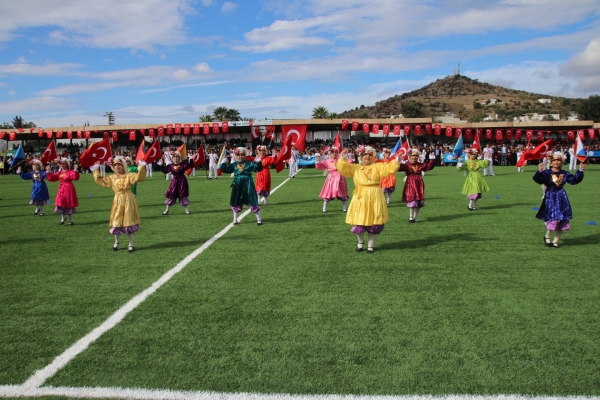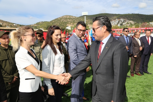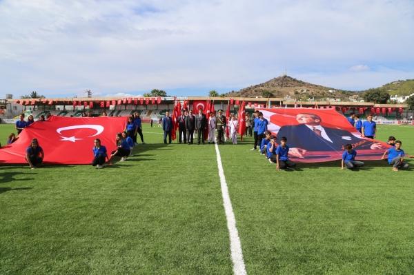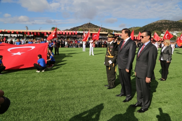 Bodrum Kaymakamı Bekir Yılmaz, Bodrum İlçe Garnizon Komutanı Personel Albay İzzet Adagideli ve Bodrum Belediye Başkanı Mehmet Kocadon'un statta bulunanların bayramını kutlamasıyla başlayan Cumhuriyet Bayramı kutlama programı saygı duruşunda bulunulması ve İstiklal Marşı’nın okunmasıyla devam etti.