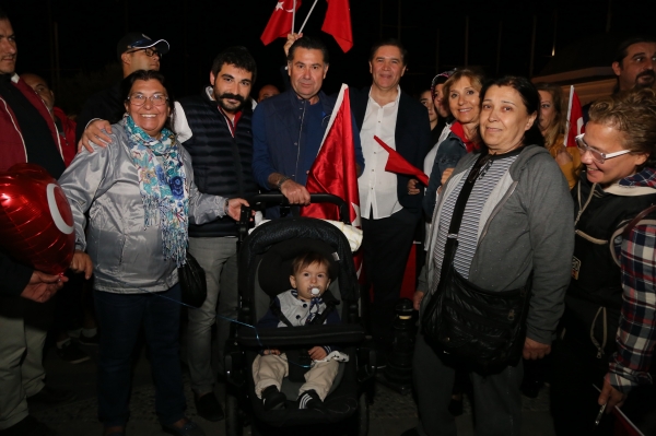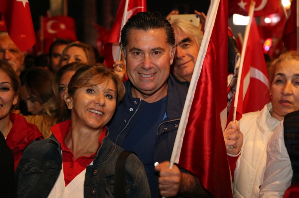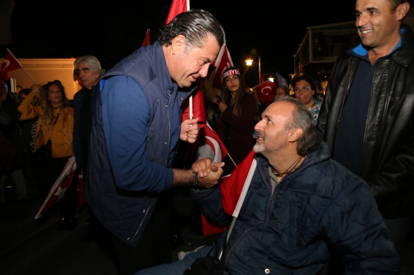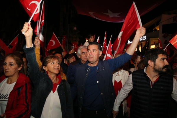 Neyzen Tevfik Caddesi boyunca ellerinde meşaleler, Türk Bayrakları ile marşlar eşliğinde yürüyen vatandaşlara mekânlarda bulunanlar da alkışlarla destek verdi.