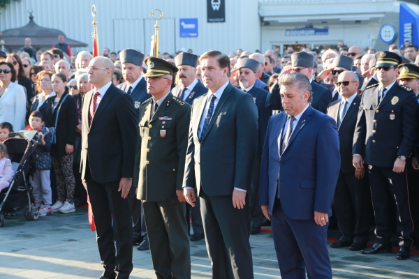 Meydandaki Atatürk anıtının önüne çelenk sunulmasının ardından Mustafa Kemal Atatürk'ün hayata gözlerini yumduğu saat 09.05’te, sirenler eşliğinde iki dakikalık saygı duruşunda bulunularak İstiklal Marşı okundu.