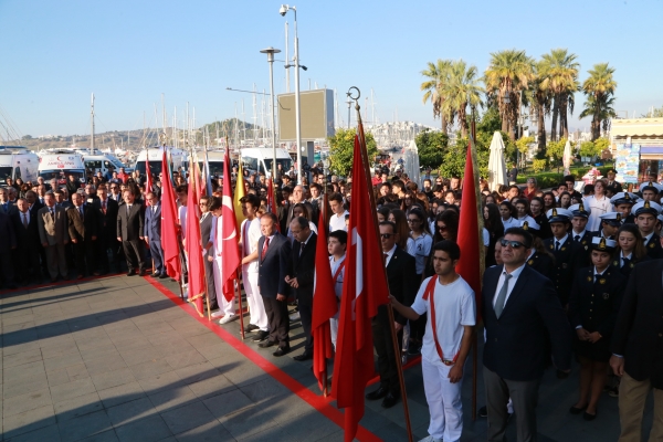 Bodrum Belediye Meydanı'nda gerçekleşen törene Bodrum Kaymakamı Bekir Yılmaz, Bodrum Belediye Başkan Vekili Taner Uslu ile Belediye Başkan Yardımcısı Kemal Orman, Bodrum Garnizon Komutanı Personel Albay İzzet Adagideli, Bodrum Cumhuriyet Başsavcısı Dr. Barış Duman, İlçe Emniyet Müdürü Ertan Sarıkaya, Muharip Gaziler Derneği Bodrum Şubesi üyeleri, siyasi parti temsilcileri, okullar, öğrenciler ve sivil toplum kuruluşu üyelerinin yanı sıra vatandaşlar katıldı.