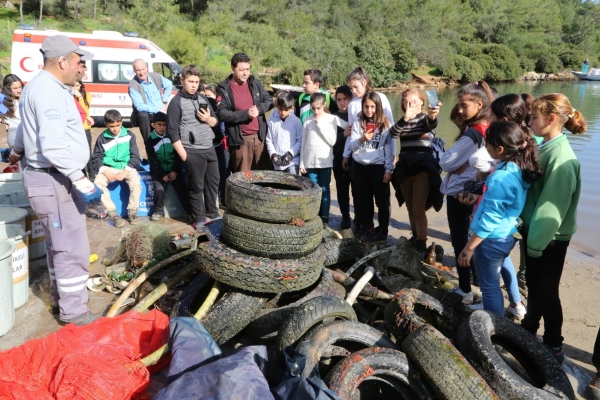 Deniz dibi temizliği hakkında öğrencilere bilgi veren ekipten 2 yıldızlı dalgıç Osman Gökmen, “4 yıldan beri dalış ekibimiz, tüm yarımada genelinde 70’e yakın dalış yaptı. Bu dalışlarda da çıkan atıkları görüyorsunuz. Bu atıklar, yüzyıllar boyunca denizlerimizde kalabiliyor ve oradaki balıkları, yaşamı ve her yeri gördüğünüz gibi kirletiyorlar. Bizler bu çalışmaları; sizin gibi gençlere bunları gösterelim, öğretelim ve denizlerimizi daha temiz tutmaya çalışalım diye yapıyoruz” dedi.