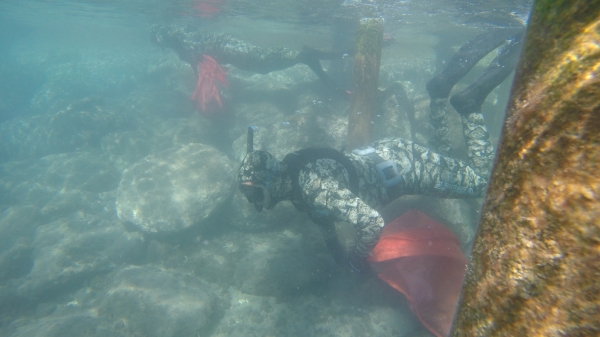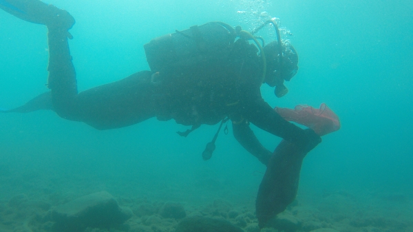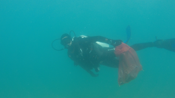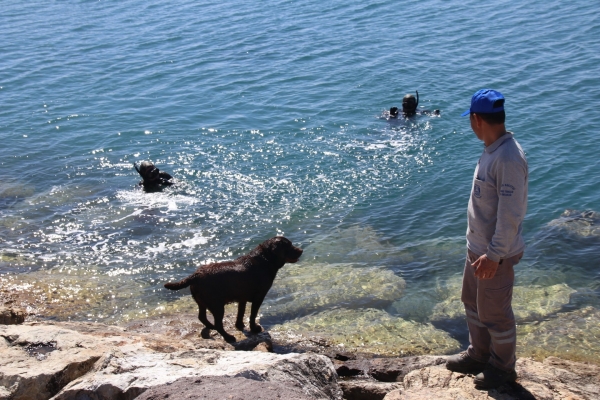 Ortakent Yahşi sahilinde haftanın ilk günü gerçekleştirilen Bodrum Belediyesi deniz dibi temizlik çalışmalarında dalgıçlarla birlikte denize açılan köpek, dalgıçların yanından ayrılmadı.