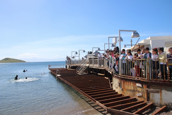 Bitez Gülümser Mehmet Danacı İlkokulu 3-B sınıfından 38 öğrenci ile öğretmenleri İlkem Karaçiçek’in de katılarak çalışmaları takip ettiği etkinlikte öğrenciler, karşılarında dalgıçlarla yüzüp oynamak için can atan sevimli köpeği görünce arkadaşlarıyla bol bol gülüp eğlendi.