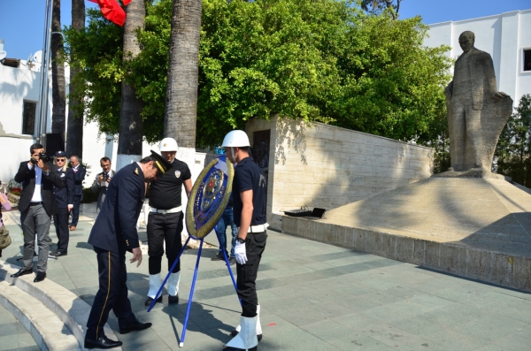 Atatürk Anıtına İlçe Emniyet Müdürlüğü'nün çelenginin konulması ile başlayan tören, saygı duruşu ve İstiklal Marşının okunması ile devam etti. Daha sonra Bodrum Kaymakamı Bekir Yılmaz ile Bodrum İlçe Emniyet Müdürü Ertan Sarıkaya günün anlam ve önemi belirten birer konuşma yaptı. Bodrum İlçe Emniyet Müdürü Ertan Sarıkaya konuşmasında, “Milletimizin sevgi ve güven desteğini almış huzur ve emniyetimizin teminatı olan Türk Polis Teşkilatının 173. Yıldönümünü kutlamak üzere toplanmış bulunmaktayız. Emniyet teşkilatı toplumda huzur ve düzeni sağlamak, vatandaşın can ve mal güvenliğini korumak, kanunun hakimiyetini ve devlet otoritesini sağlamak gibi çok önemli ve hayati görevler üstlenmiştir. Bizler bu görevi yerine getirirken demokratik laik ve sosyal hukuk devletinin bir kurumu olduğumuzu asla unutmuyoruz. Şunun bilinmesini isteriz ki 15 Temmuz’dan sonra daha da kuvvetliyiz. Ülkemizin ve milletimizin bölünmez bütünlüğüne karşı oynanan oyunlarda ve saldırılarda tüm şer odakları karşılarında bizleri bulacaklar ve asla hain emellerine ulaşamayacaklardır. Bizlere teslim edilen mukaddes emanetini, vatandaşımızın can mal ve namus dokunulmazlığını dün olduğu gibi bugün ve yarın da korumaya devam ederek meslek yeminimizde olduğu gibi vatan millet ve bayrak uğruna gerektiğinde canımızı feda etmekten çekinmeyeceğiz” ifadelerini kullandı.