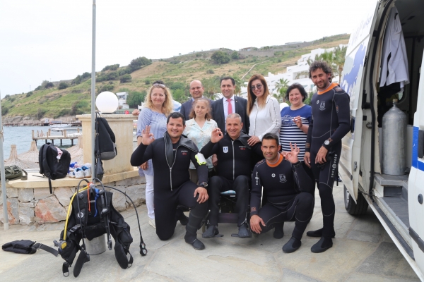 Bardakçı Koyu Salmakis Otel önünde, Bodrum Belediyesi Dalış Ekibinin yardımlarıyla gerçekleşen etkinliğin hazırlık aşamasında Tuncay Kırbaş’a; eşi Soner Kırbaş, Aile ve Sosyal Politikalar Bakanlığı Muğla İl Müdürü İlkay Türkoğlu, Şube Müdürü Kudret Gültaş, Muğla Engelliler Derneği Başkanı Emine Çakıroğlu ve dernek yönetim kurulu üyesi Melek Yalçındağ ile belediye yetkilileri eşlik etti.