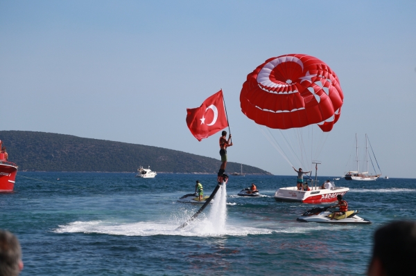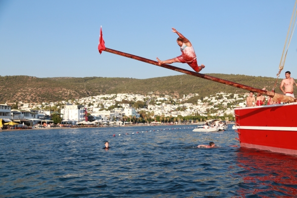 Protokol üyeleri tarafından denize çelenk bırakılması, saygı duruşunda bulunulması ve İstiklal Marşı’nın okunmasının ardından başlayan kutlamalar kapsamında düzenlenen birbirinden çekişmeli yarışmalar, coşkulu anlar yaşattı. Yağlı direk yarışmasını kazanan Mert Derim, izleyicilerden büyük alkış aldı.