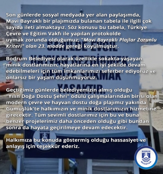 Son günlerde sosyal medyada yer alan paylaşımda, Mavi Bayraklı bir plajımızda bulanan tabela ile ilgili çok sayıda ileti almaktayız. Söz konusu bu tabela, Türkiye Çevre ve Eğitim Vakfı ile yapılan protokolde uymak zorunda olduğumuz; "Mavi Bayraklı Plajlar Zorunlu Kriteri" olan 23. madde gereği koyulmuştur.