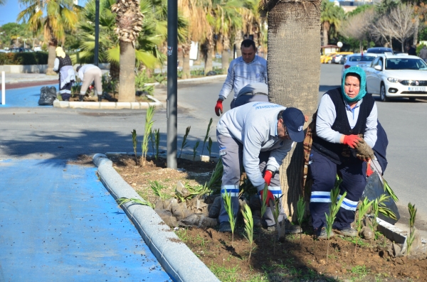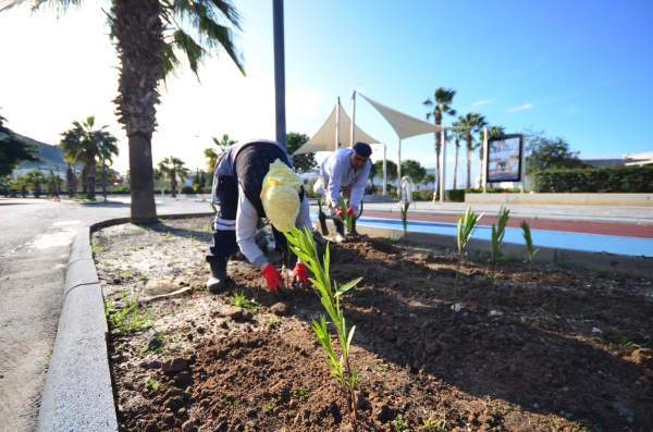 Bodrum Belediyesi Park ve Bahçeler Müdürlüğü, Turgutreis Mahallesi Gazi Mustafa Kemal (GMK) Bulvarı’nda sahil ve çevre düzenleme projesi kapsamında yapımı tamamlanan alt yapı çalışmaları sonrası peyzaj ve saha çalışmalarını sürdürüyor.
