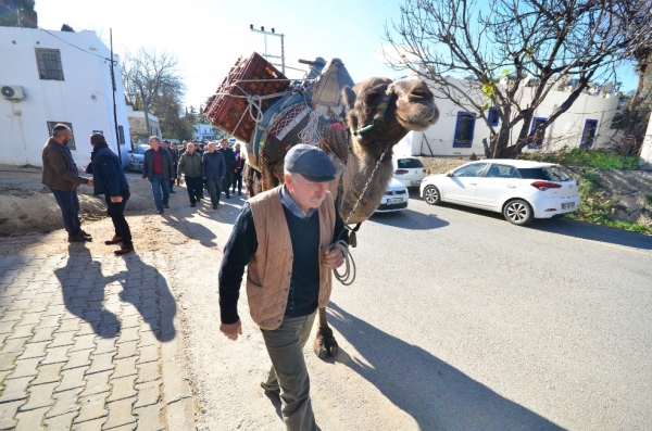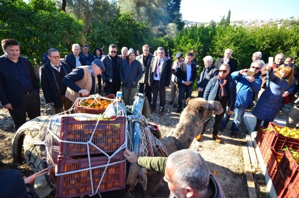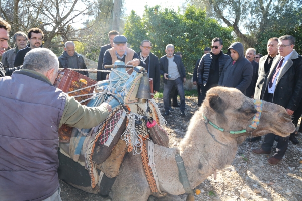 Katılımcılar daha sonra Bitez’de bulunan bir mandalina bahçesine geçerek mandalina hasadına katıldı. Etkinlikte mandalinanın hangi aylarda ve ne şekilde hasat edildiğine dair bilgiler verildi. Hasadı yapılarak toplanan mandalina sepetleri deveye yüklenerek Bitez köy içine doğru yola çıktı.