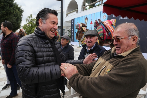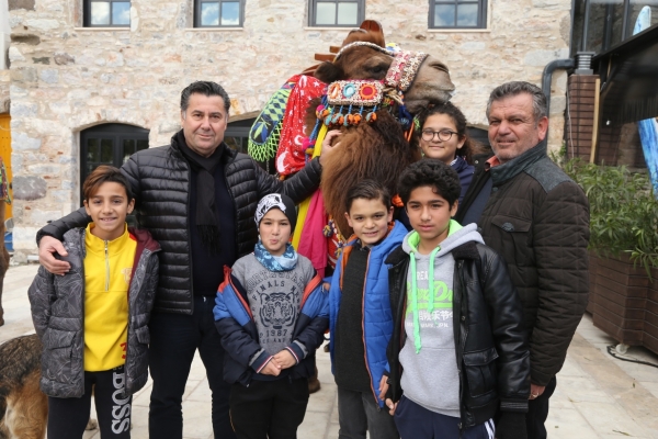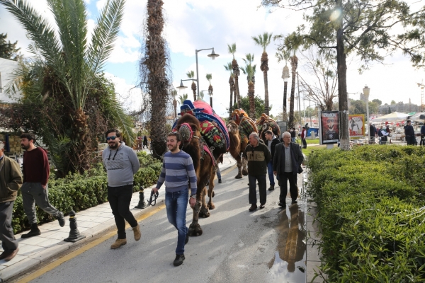 Yürüyüşe katılan develeri, kortejin son durağı marinada, Bodrum Belediye Başkanı Mehmet Kocadon karşıladı.