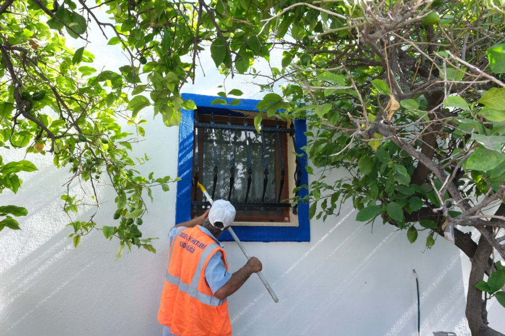 Destek Hizmetleri Müdürlüğü ekiplerimiz, Bodrum sokaklarında mavi söve çalışmasını Bitez Köy İçi'nden başlattı. Yaz başında başlayan çalışmalar kapsamında toplamda 19 ev ve iş yerinin dış cephesi beyaza boyanırken kapı ve pencere söveleri de maviye boyandı. Ekiplerimiz, belirlenen plan doğrultusunda boyama çalışmalarına devam edecek.